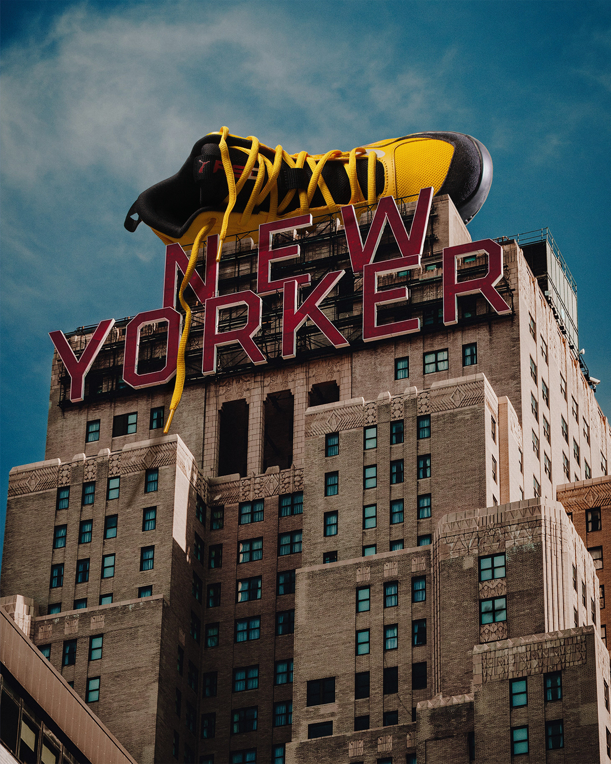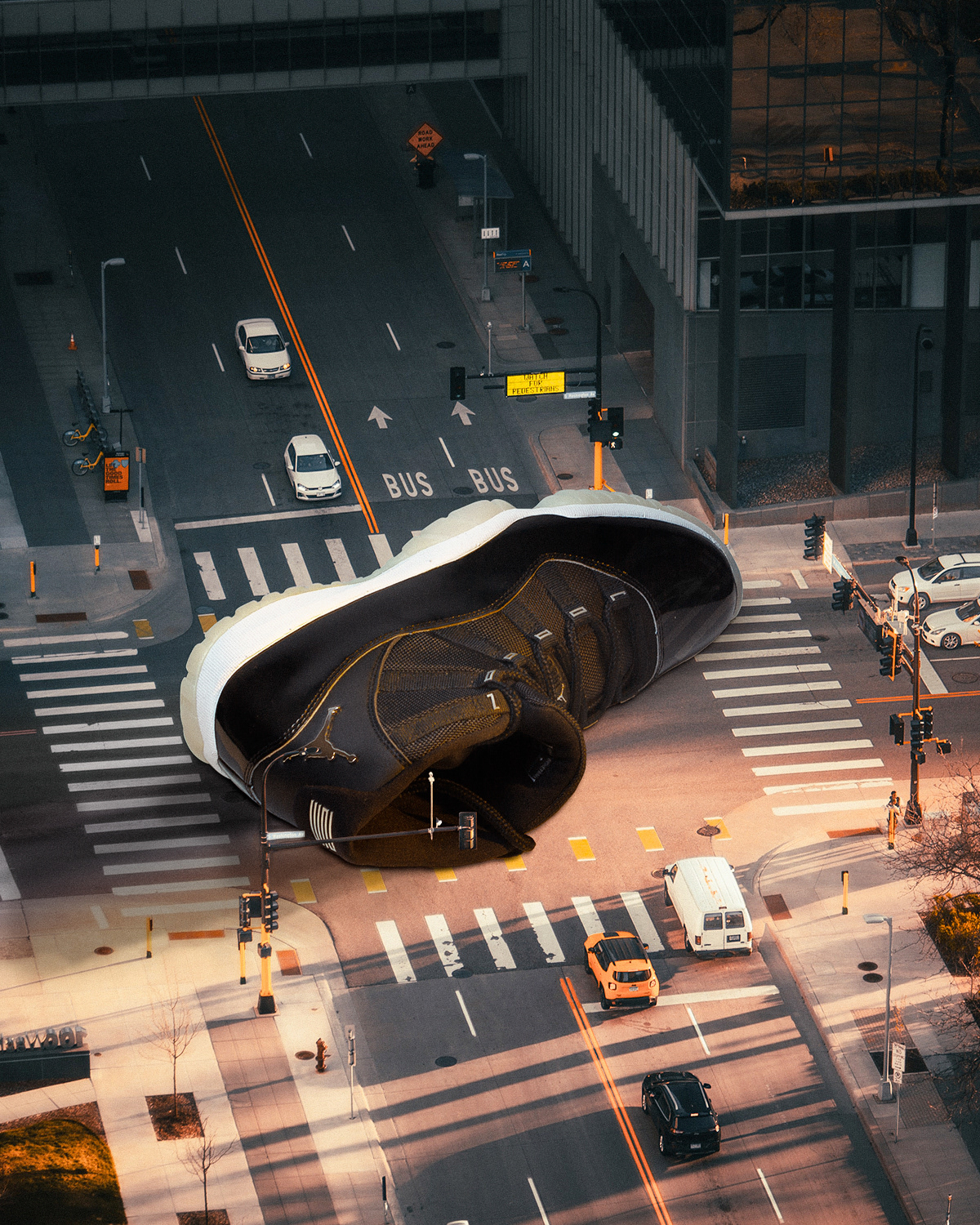 Using stock photography for the environment. I decided to photograph these sneakers while mimicking the natural light from the images to get the most impact. While also adding the right proportions and shadows in post-production.